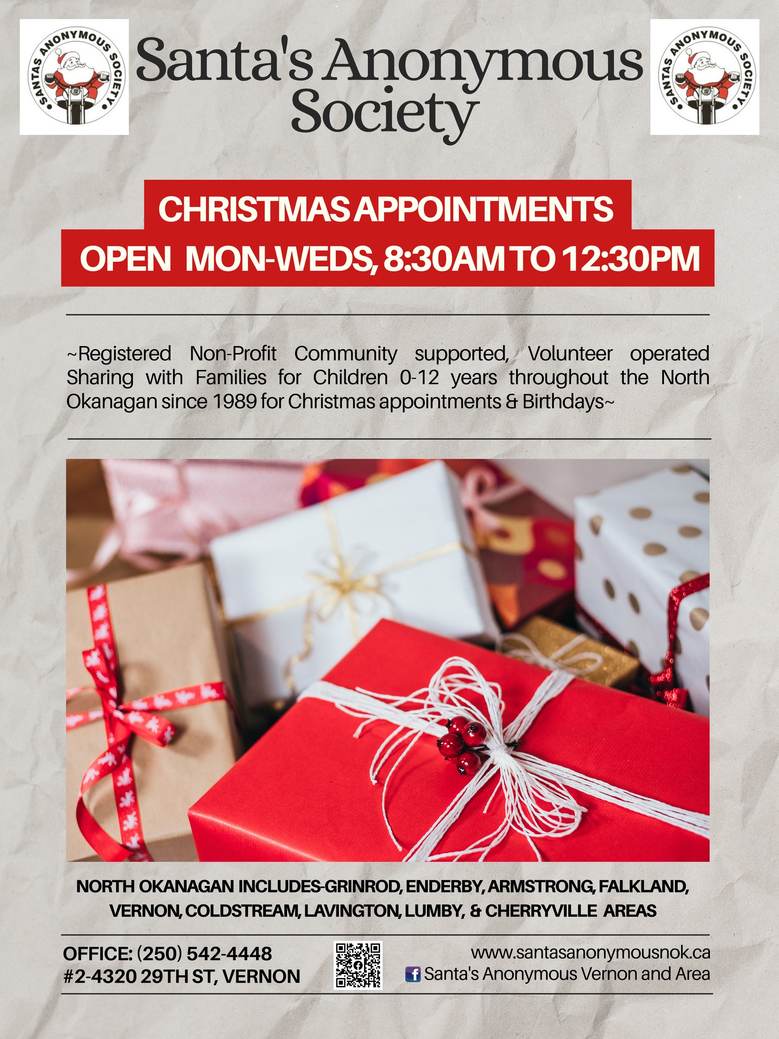 ![]() We are now open 8:30am - 12pm Monday - Tuesday - Wednesday also open for Birthdays by appointment (250-542-4448) For children in need in the North Okanagan district ages 12 and under. We require you to bring your child’s health care card and due to the Cold and Flu season we ask that you bring a face mask and one family member only to come in. Donations can be dropped off at or phone Perry 250-308-1411 to make other arrangements We at Santa’s Anonymous appreciate the support of the community helping us help kids. |